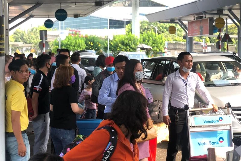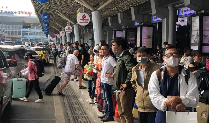 Sau tết, tần suất các chuyến bay kín mít tại sân bay Tân Sơn Nhất khiến khách xếp hàng dài để chờ xe về nhà. Ảnh: P.ĐIỀN