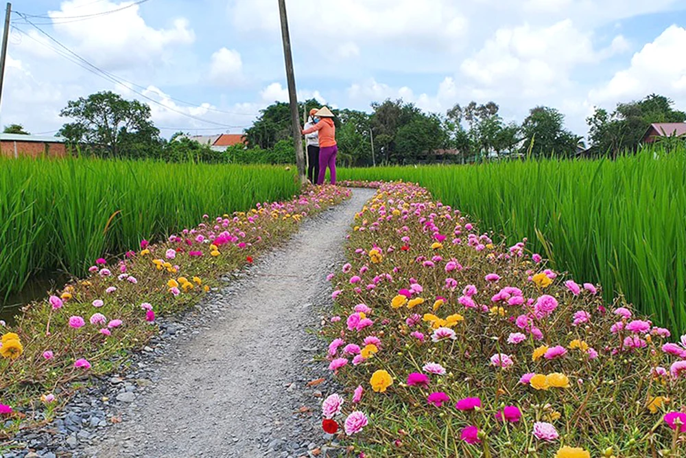 Con đường hoa đi xuyên qua cánh đồng của một người dân tại xã Quy Đức, Bình Chánh thu hút nhiều người tới chụp ảnh. Ảnh: ĐẶNG LÊ