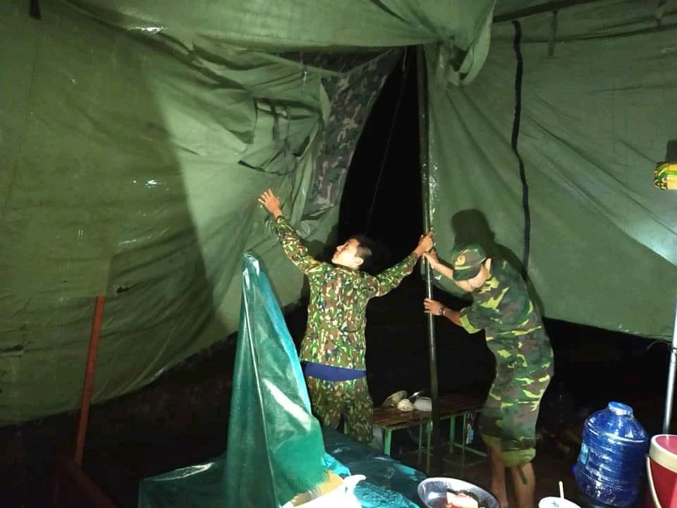 Cán bộ chiến sĩ Đồn Biên phòng Vĩnh Gia tổ chức gia cố lại lán trại, thay khung sắt bằng khu gỗ, vừa vững chắc, vừa tránh sét bởi các lán trại đều dựng giữa đồng trống.