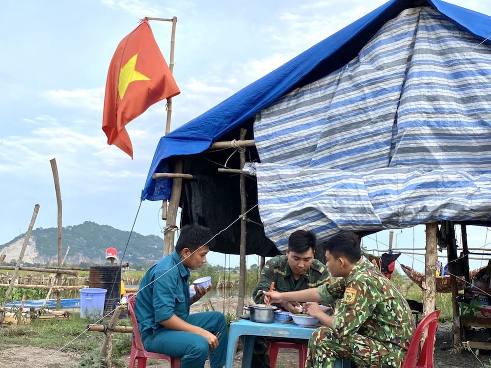 Tổ công tác phòng, chống dịch số 14, Đồn Biên phòng Vĩnh Ngươn với bữa cơm chiều đơn sơ, đạm bạc.