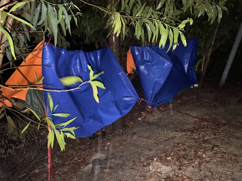 Các cán bộ chiến sĩ mắc võng, che bạc chợp mắt sau thời gian làm nhiệm vụ.