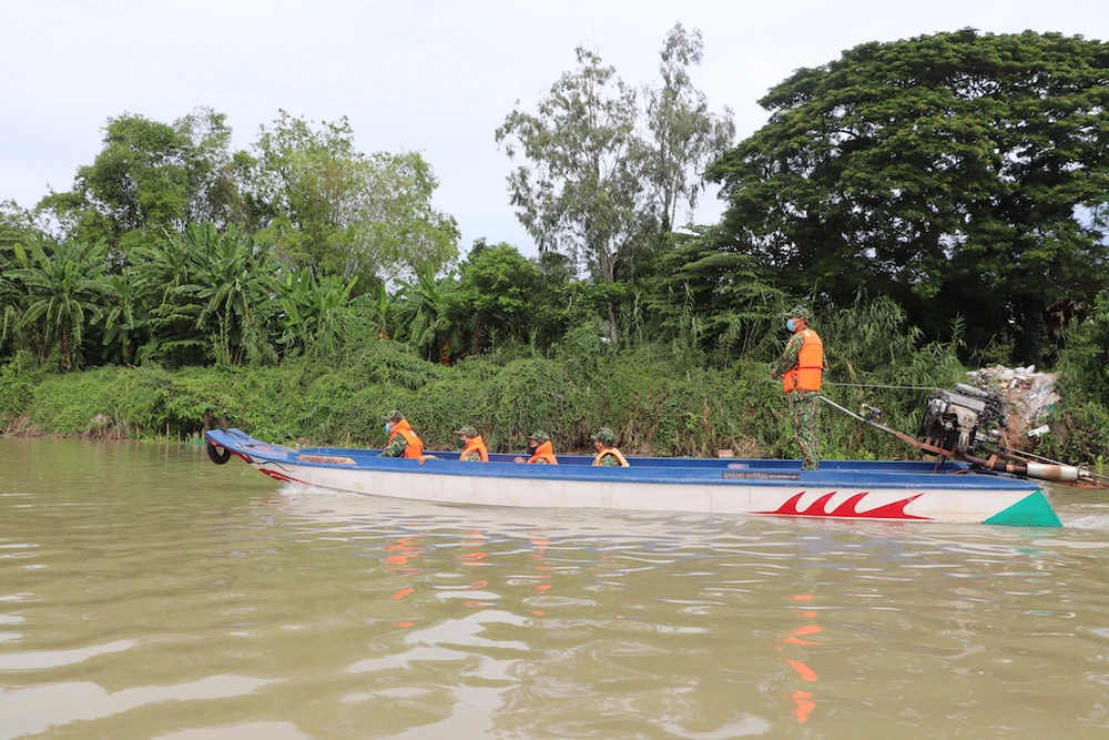 Các Tổ, chốt phòng, chống dịch Đồn Biên phòng cửa khẩu Long Bình tuần tra kiểm soát trên sông. Nhiều người lợi dụng tuyến này để xuất nhập cảnh trái phép.