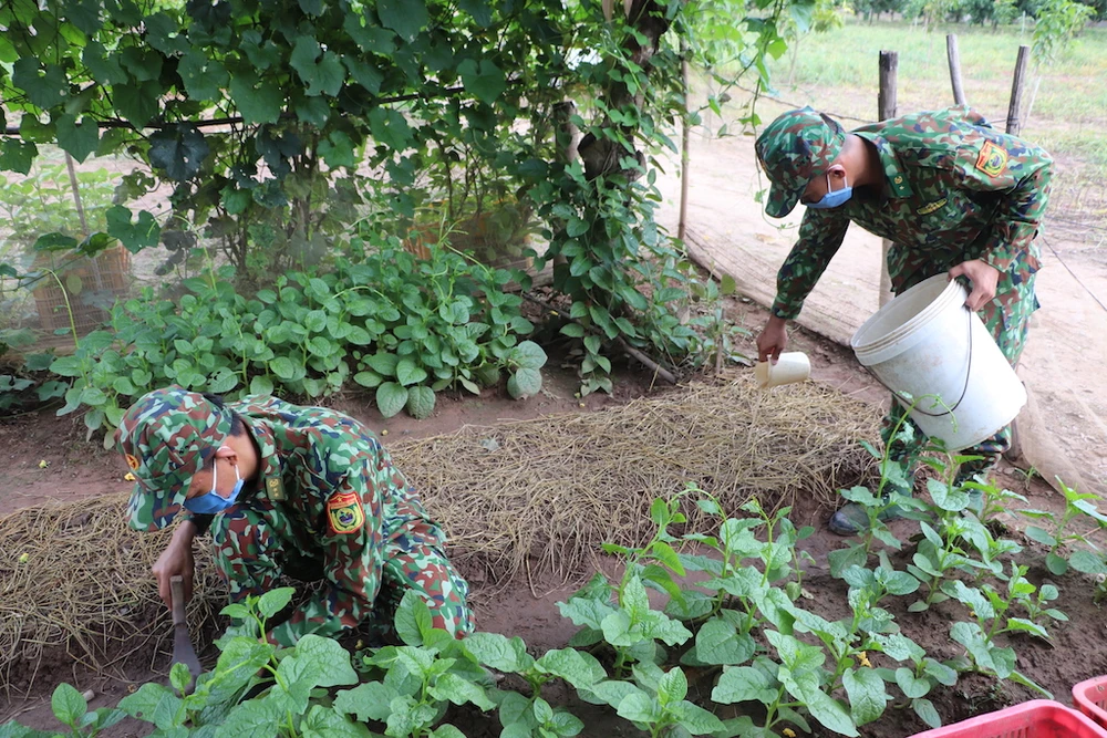 Chốt COVID-19 số 2 thuộc Đồn Biên phòng cửa khẩu quốc tế Vĩnh Xương tranh thủ thời gian tăng gia sản xuất, cải thiện bữa ăn.