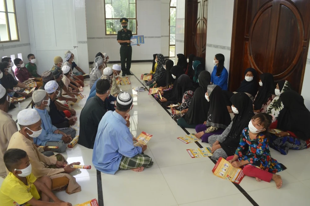 Đồn Biên phòng Nhơn Hội tuyên truyền cho đồng bào dân tộc Chăm ở ấp Búng Lớn, xã Nhơn Hội, huyện An Phú các biện pháp phòng, chống COVID-19.