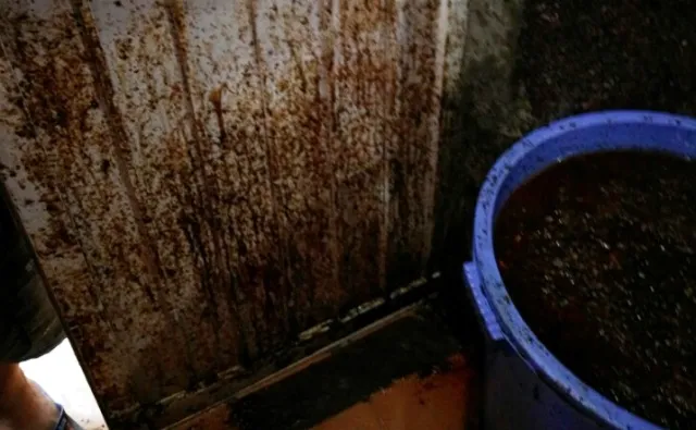 Thùng thịt tẩm ướp để cạnh nhà vệ sinh hôi thối. Ảnh: CTV