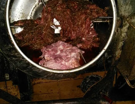 Nhiều thau đựng thịt để cạnh nhà vệ sinh bốc mùi. Tất cả số thịt nói trên không có giấy chứng nhận kiểm dịch. Ngoài ra, đoàn còn phát hiện một số dụng cụ phục vụ quá trình sơ chế, tẩm ướp cũ kỹ, cáu bẩn.