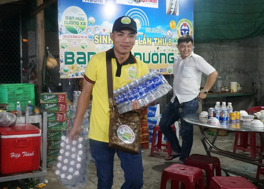 Sau khi hội ý, họ quyết định tặng số nước suối được người dân xung quanh hỗ trợ cho tất cả các xe đi đường. Ảnh: QUỐC VŨ