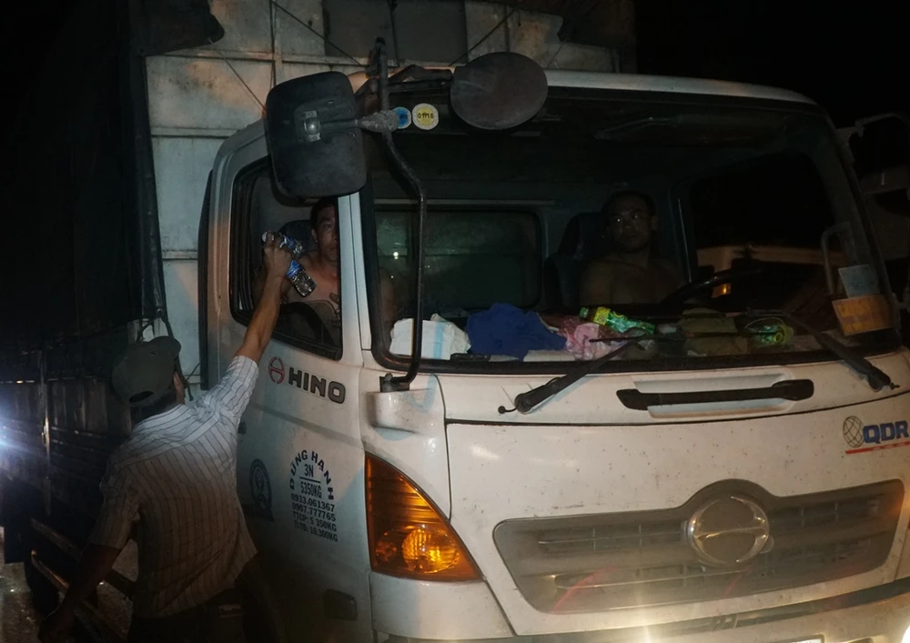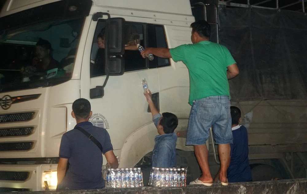 Các tài xế đứng lên trên dải phân cách để phân phát nước cho các xe lớn đi ngang qua. Ảnh: QUỐC VŨ