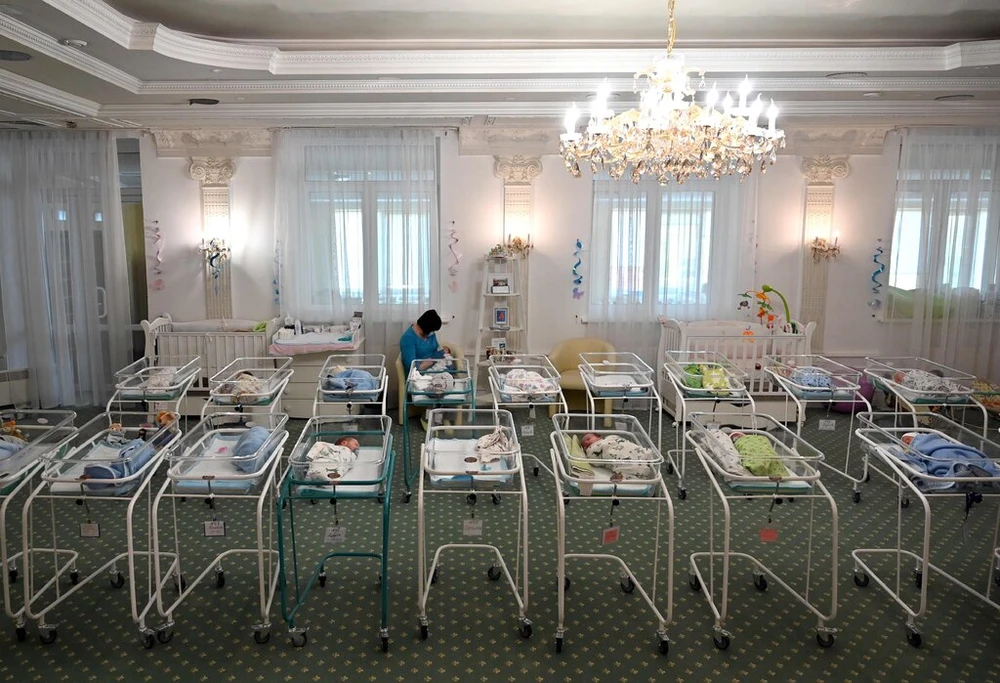 Những đứa trẻ sơ sinh bị kẹt ở một khách sạn thủ đô Kiev, Ukraine vì bố mẹ chúng không thể đến nhận con do hạn chế đi lại thời đại dịch. Ảnh: AFP/GETTY/NEW YORK TIMES