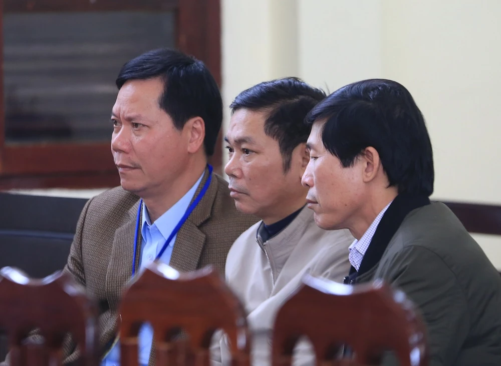 Bị cáo Trương Quý Dương, Trần Văn Thắng và Hoàng Đình Khiếu (từ trái qua) tại tòa. Ảnh: TP