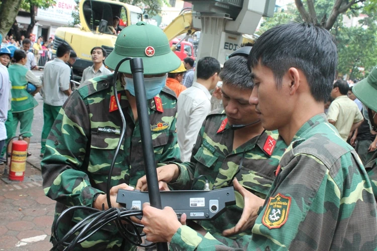 Lực lượng chức năng triển khai máy do tìm nạn nhân cuối cùng vụ sập tòa nhà. Ảnh: Viết Long
