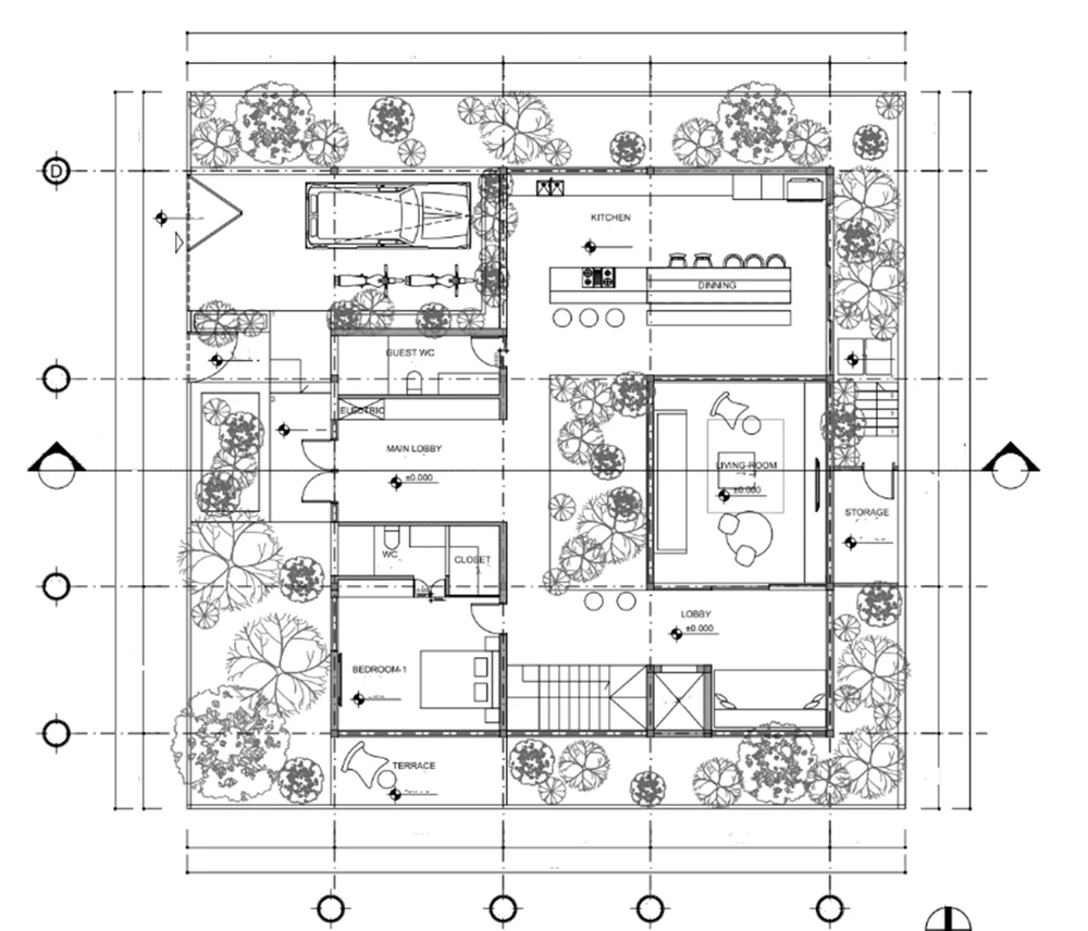 Tầng trệt ngôi nhà gồm nơi để xe, sân vườn nhỏ, một toilet chung, khu vực bếp nối thông với phòng ăn, phòng khách, phòng ngủ cho ông bà và thang máy.