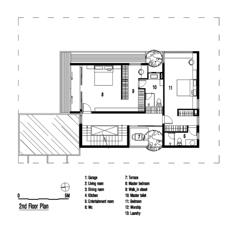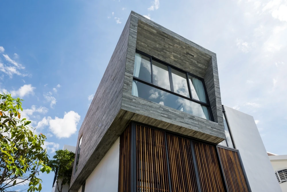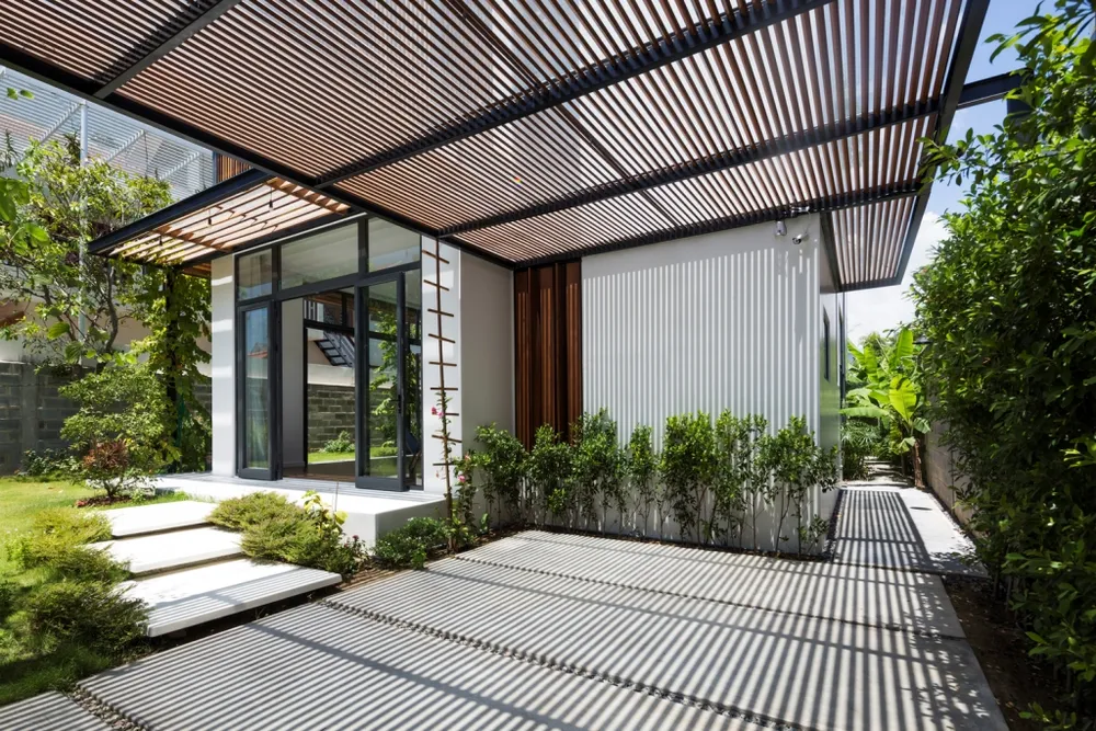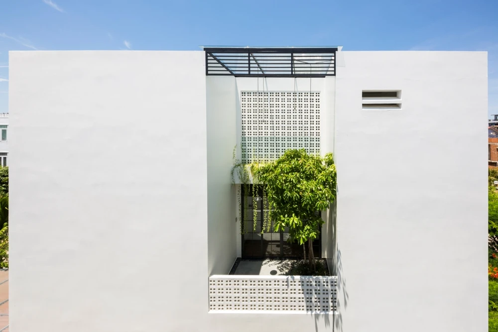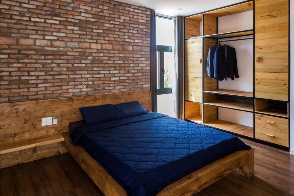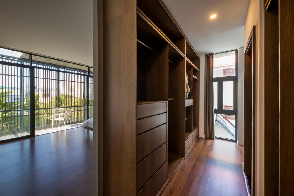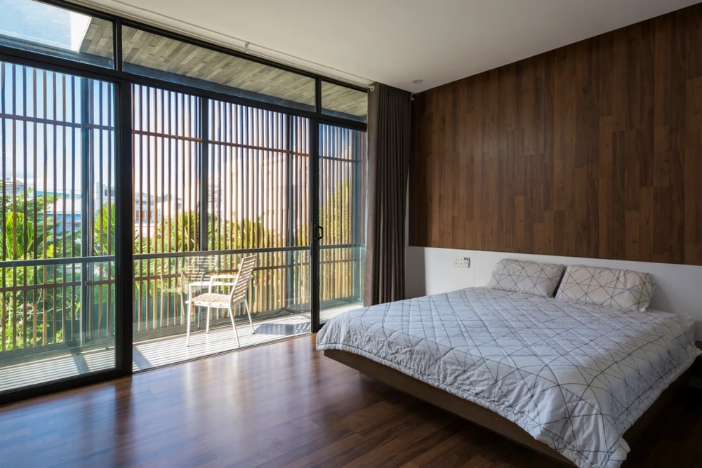 Phòng ngủ được bảo vệ với thanh lam chắn nhằm giảm bớt lượng nắng và gió vào nhà.