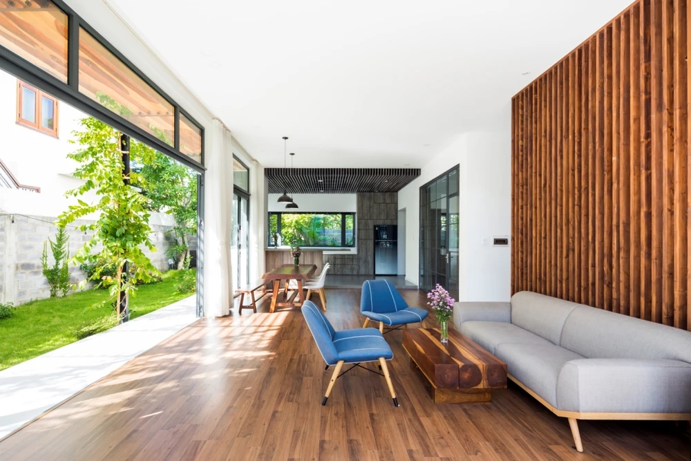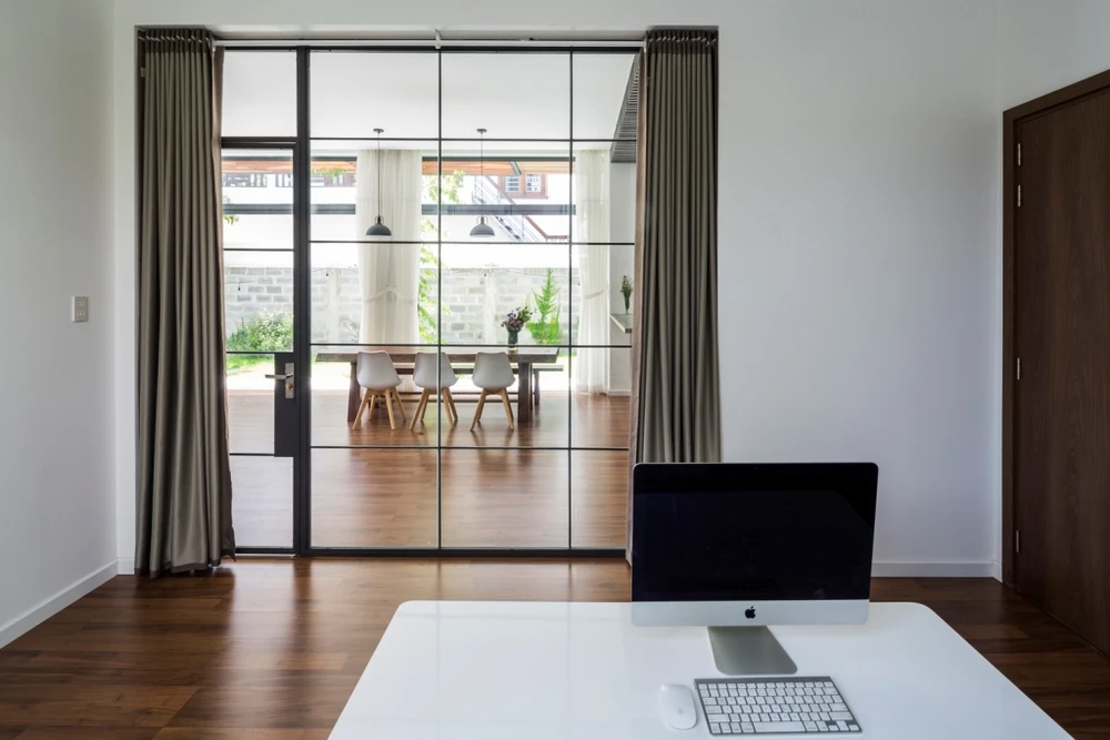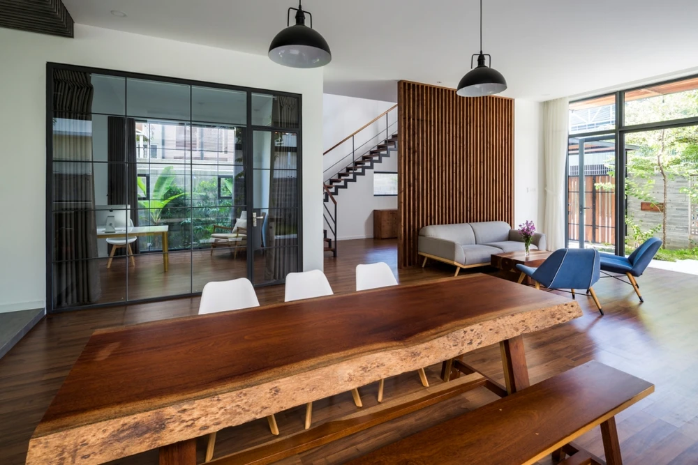 Thay vào đó là những bộ bàn ghế, thanh ray bằng gỗ hay những tấm kính lớn để kết nối không gian.