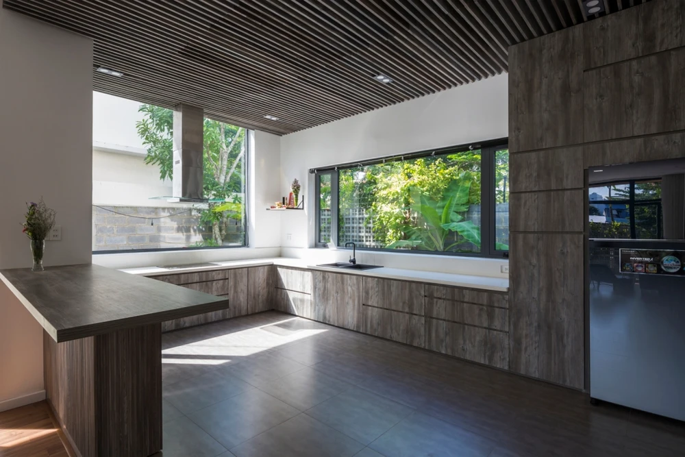 Ngay tại không gian bếp, bàn ăn, hệ thống cửa thông ra sân vườn được thiết kế linh hoạt nhằm tạo sự kết nối tối đa giữa trong nhà và ngoài trời.