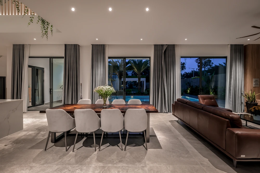 Không gian sinh hoạt bếp và bàn ăn, phòng khách bố trí theo tuyến giúp tiếp cận sân vườn phía sau và sân vườn hồ bơi một cách trọn vẹn nhất. Ngoài ra, còn giúp cho sự đối lưu gió và phân bổ ánh sáng tự nhiên.