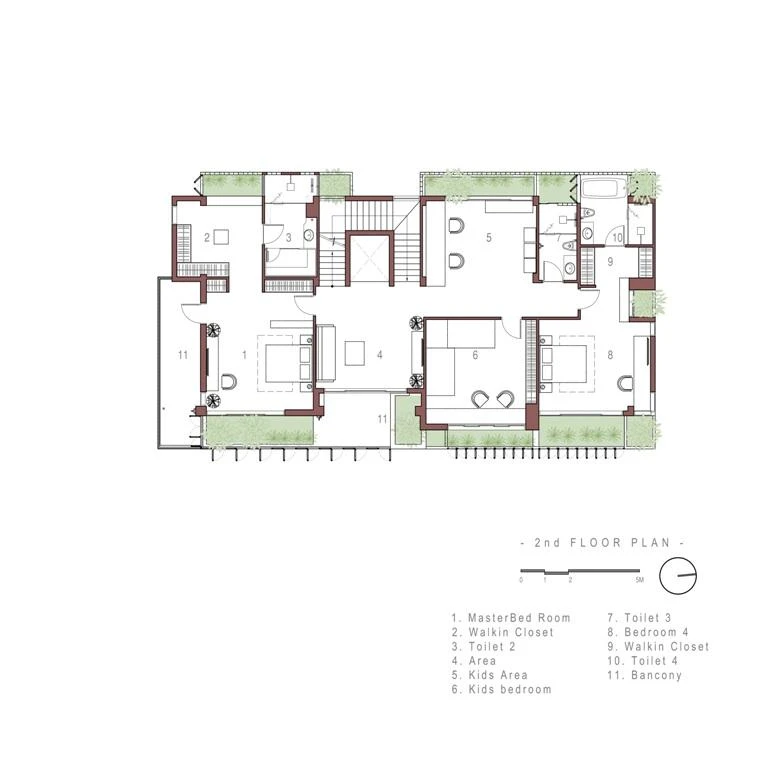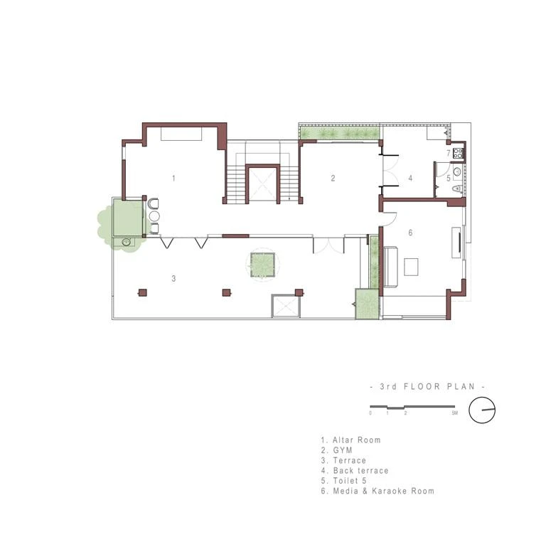 Mặt hướng tây được bố trí các chức năng phụ như vệ sinh, cầu thang, các gian sinh hoạt như phòng gym, phòng học trẻ em được tách biệt bởi ban công cây xanh và hệ tường gạch hoa gió.
