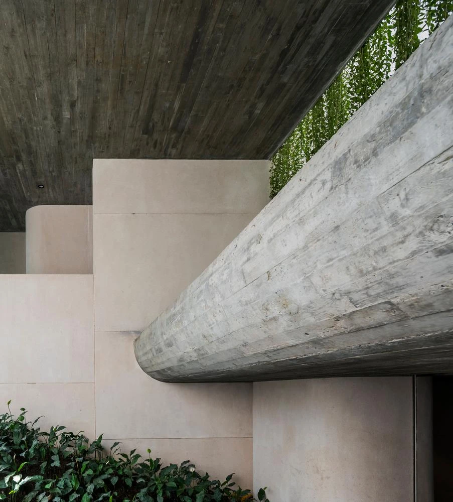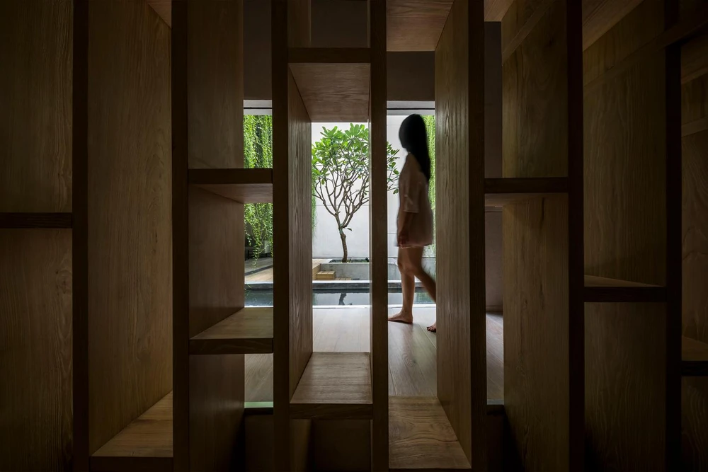 Bên trong lại chứa đựng rất nhiều lớp không gian, các khoảng sáng tối xen kẽ, xen lẫn với vật liệu thô mộc của bê tông, đá rửa.