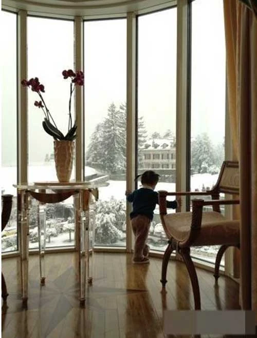 Con gái Triệu Vy đứng bên cửa sổ ngắm tuyết.