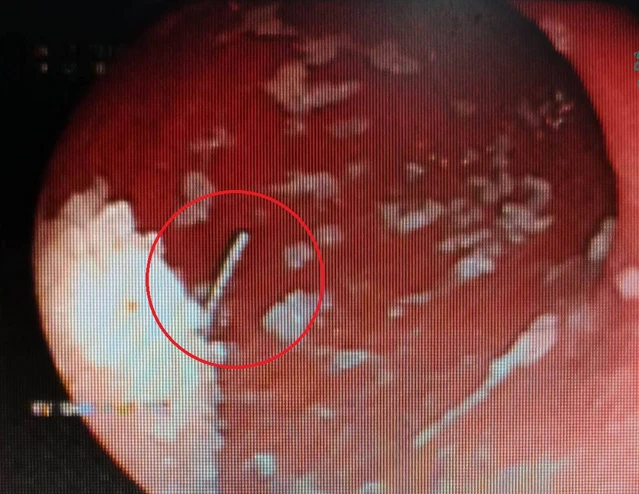 Các bác sĩ nhanh chóng nội soi và phát hiện một dị vật tròn, nhỏ, khá dài cắm vào thành thực quản bệnh nhân, nằm lẫn trong thức ăn. Sau khi gắp ra ngoài, các bác sĩ ghi nhận kim may công nghiệp dài 2,5 cm, đầu nhọn.
