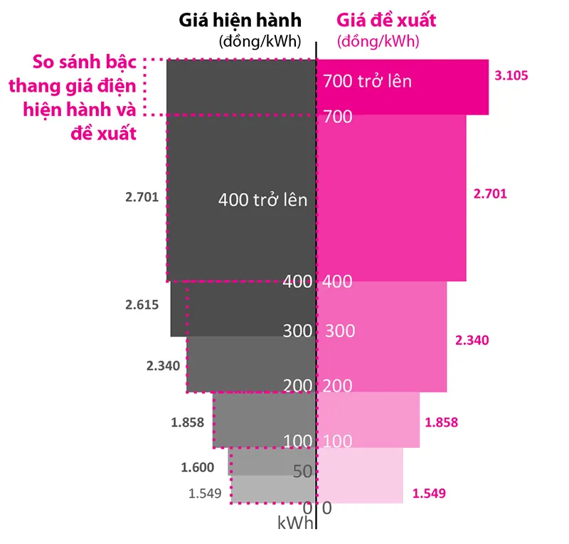 Biểu đồ so sánh giá bán lẻ điện hiện nay (sáu bậc) và mức đề xuất năm bậc thang của Bộ Công Thương. Đồ họa: HỒ TRANG