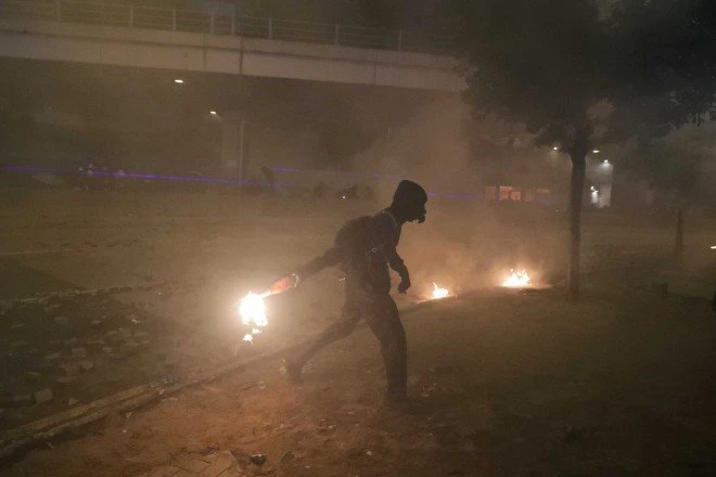 Một người biểu tình ném bom xăng về phía cảnh sát bên ngoài trường. Ảnh: SCMP