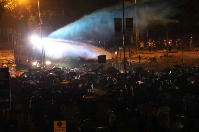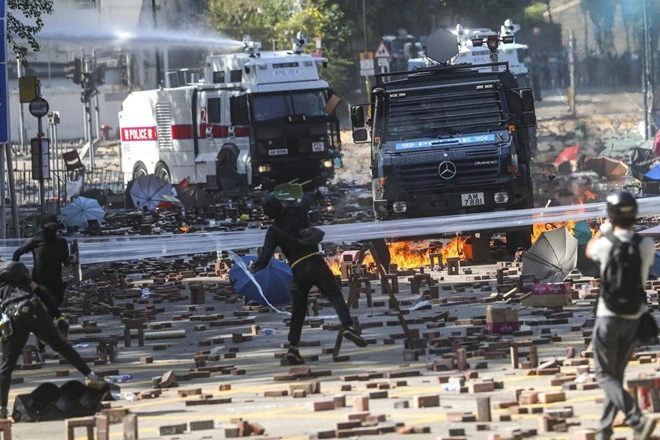Nhóm người biểu tình cố thủ trước vòi rồng và hơi cay từ phía cảnh sát trên đường Austin. Ảnh: SCMP