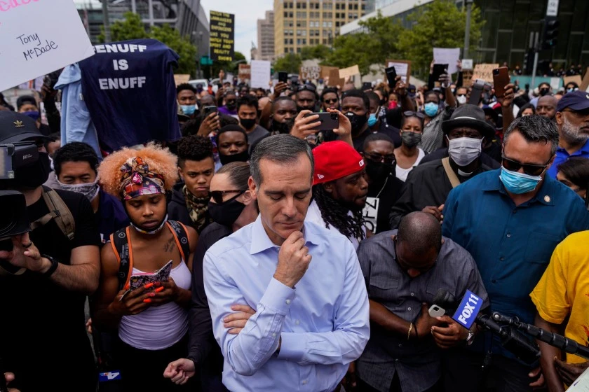 Thị trưởng Eric Garcetti sát cánh cùng người biểu tình trên đường phố Los Angeles. Ảnh: KENT NISHIMURA/ LOS ANGELES TIMES