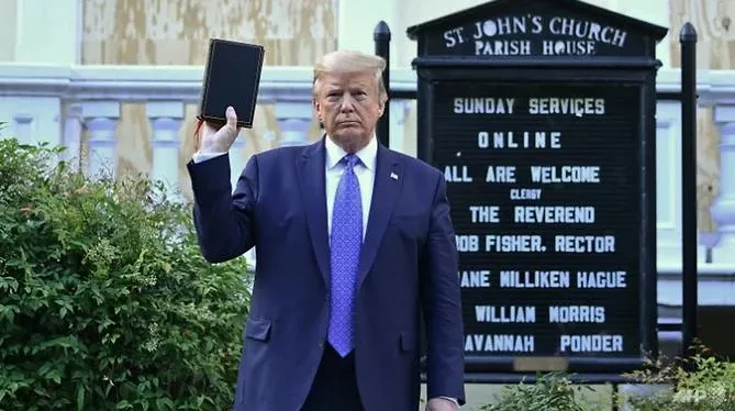 Tổng thống Mỹ Donald Trump cầm bản Kinh Thánh bên ngoài nhà thờ St John’s Episcopal gần công viên Lafayette, sau khi cảnh sát liên bang giải tán người biểu tình. Ảnh: AFP/BRENDAN SMIALOWSKI