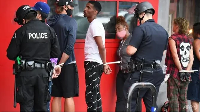 Người biểu tình bị bắt ở Hollywood, bang California (Mỹ) vì vi phạm lệnh giới nghiêm. Ảnh: AFP/ROBYN BECK