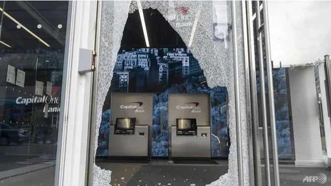 Một ngân hàng ở TP New York bị đập vỡ cửa. Ảnh: AFP/JOHANNES EISELE