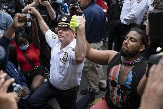 Ông Terence Monahan, cảnh sát trưởng TP New York cùng quỳ với người biểu tình. Ảnh: AP