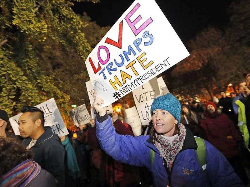 Ông Trump có mặt trong tòa nhà để chuẩn bị nhân sự cho bộ máy chính phủ tương lai. Vào lúc biểu tình đang diễn ra bên ngoài, ông viết trên Twitter kêu gọi: “Đây là thời điểm trọng đại trong cuộc sống mọi người Mỹ. Chúng ta phải đoàn kết và chúng ta sẽ thắng, thắng, thắng”. Tại Los Angeles, hơn 10.000 người tham gia biểu tình. Sau cuộc biểu tình vào tối 11-11, có hơn 200 người bị bắt.