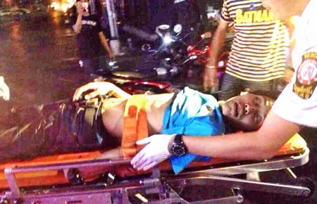 Một nhân viên an ninh của Ủy ban Cải cách dân chủ nhân dân bị thương trong vụ nổ súng lúc 2 giờ 35 phút sáng 11-1 ở giao lộ Kokwua gần khu vực tượng đài Dân chủ ở Bangkok. Ảnh: MALLIKA TWITTER