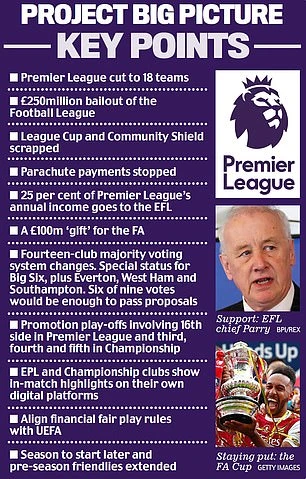 Theo The Sun (Anh), MU và Liverpool là hai CLB dẫn đầu dự án này và họ hi vọng 4 đội còn lại cùng tham gia. Kế hoạch gồm rất nhiều vấn đề trong đó giảm số lượng đội ở giải ngoại hạng Anh từ 20 xuống còn 18, giảm suất xuống hạng trong tương lai. Kế hoạch mang tên Project Big Picture còn đề xuất loại bỏ hai giải League Cup và Community Shield Cup. Nó cũng giúp các CLB nhỏ có thêm nguồn thu vượt qua đại dịch COVID-19.