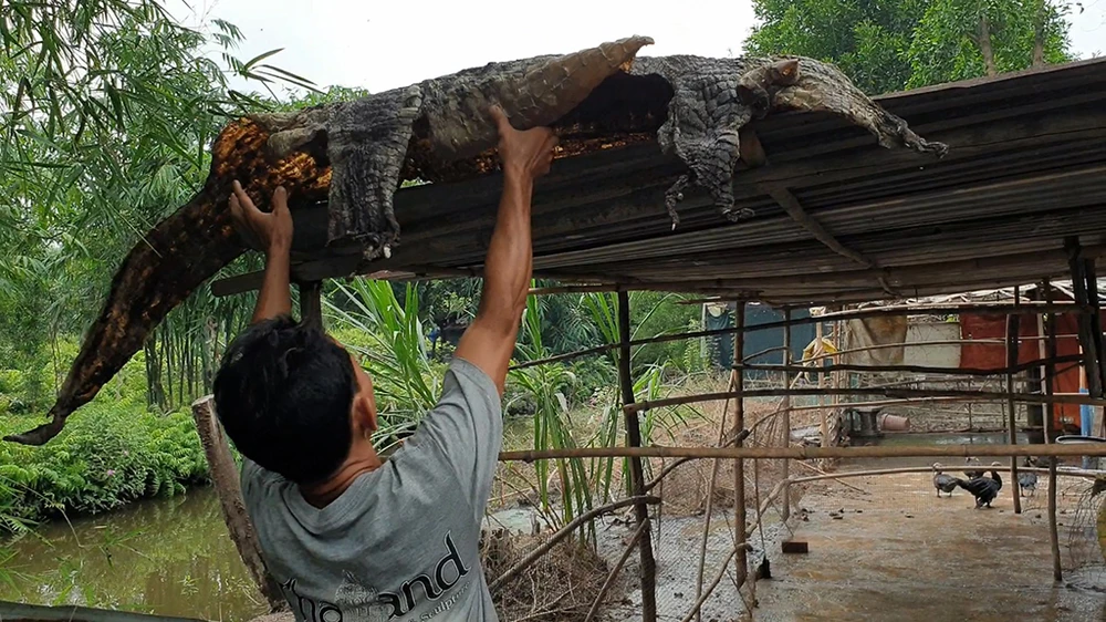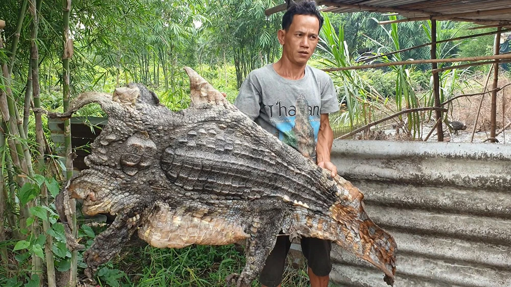 Trong đó, con cá sấu được anh Thanh bắt tại vườn có trọng lượng gần 80kg, dài hơn 2 mét. Ảnh NT