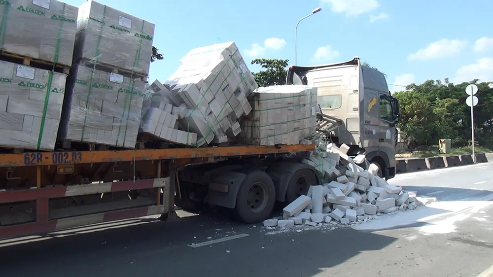 Tại hiện trường, số lượng đá xây dựng thành phẩm tràn xuống đường khá lớn. Đến 16 giờ cùng ngày, hiện trường vẫn chưa được khắc phục xong.