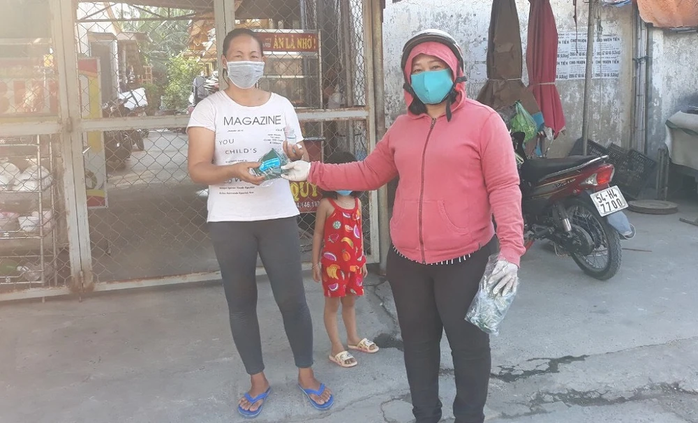 Tổ công tác cũng kết hợp tặng khẩu trang cho người dân. Ảnh: VLB