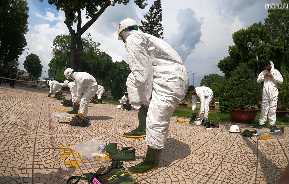 Từ 14 giờ chiều cùng ngày, các cán bộ chiến sĩ tập trung ở khu vực Công viên Gia Định để làm công tác chuẩn bị. Họ mặc trang bị bảo hộ, kiểm tra hệ thống bơm, áp suất nén... trước khi thực hiện công việc. Ảnh NT
