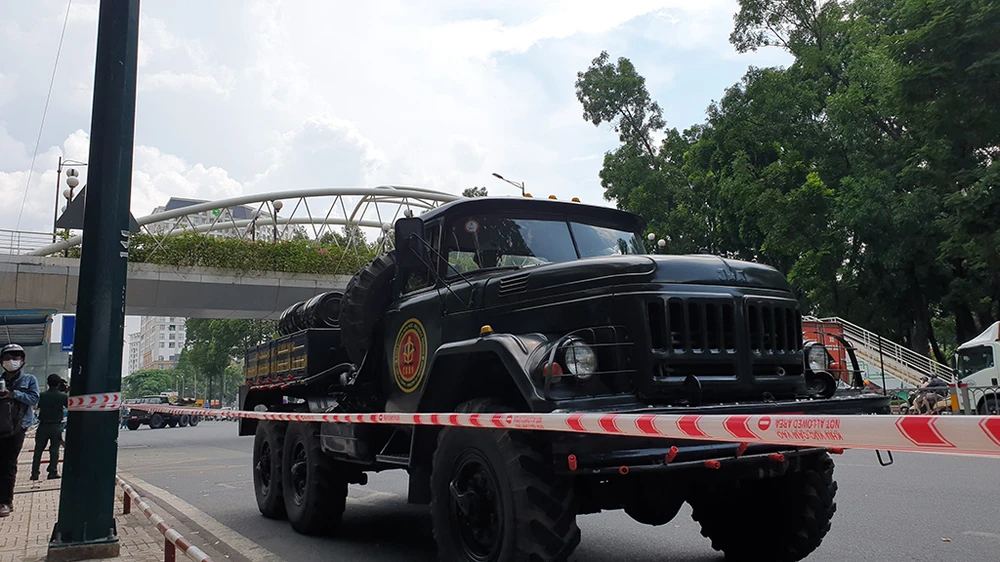 Theo đại tá Từ Minh Sơn, Trưởng phòng hóa học Quân khu 7, đây là lần đầu tiên đơn vị triển khai phun khử độc, phòng dịch trên địa bàn TP HCM. Ảnh NT