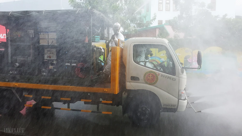 Chiều ngày 1-6, Trung tâm ứng cứu sự cố hóa học, sinh học, phóng xạ hạt nhân thuộc Binh chủng Hóa học, Bộ quốc phòng huy động lực lượng triển khai phun khử khuẩn nhiều tuyến đường trên địa bàn quận Gò Vấp. Ảnh NT