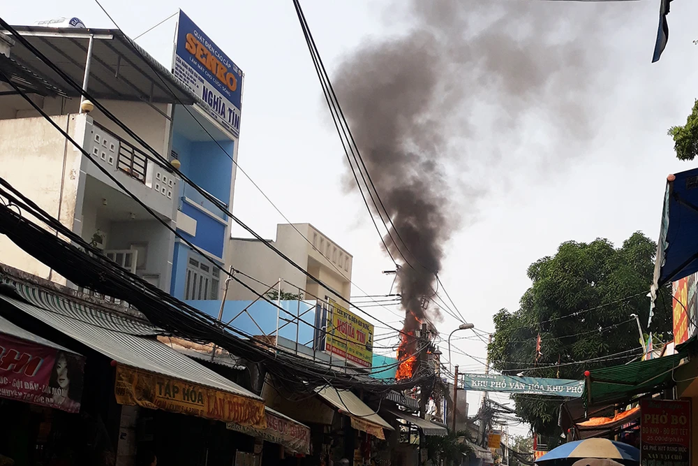 Tiếng nổ lớn khiến nhiều người dân hoảng hốt tháo chạy ra khỏi nhà. Lửa sau đó bốc lên, bén vào dây cáp viễn thông cháy ngùn ngụt, khói đen khét lẹt tỏa ra khắp nơi.