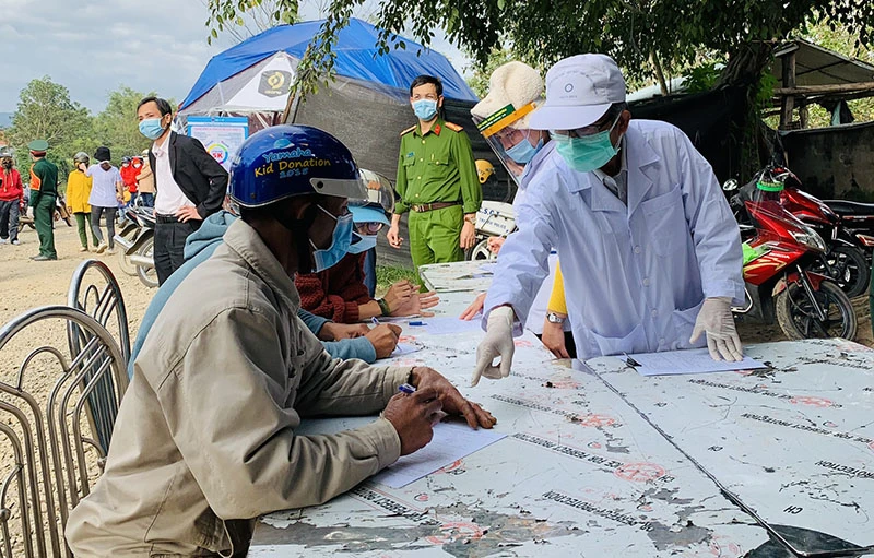 Người dân khai báo y tế tại một chốt kiểm soát ở Bình Định. Ảnh: THANH MAI