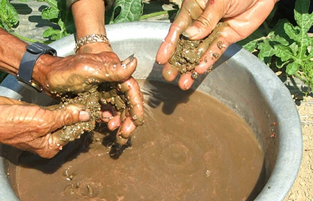 Khi cho vào nước, phân bón giả vón thành đất sét. Ảnh: TL