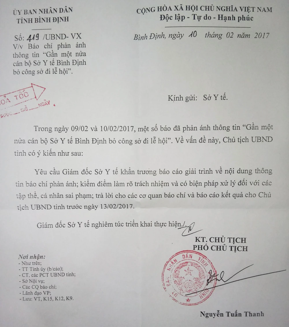 Công văn do ông Nguyễn Tuấn Thanh, Phó Chủ tịch UBND tỉnh, ký, viện dẫn tít tin đăng trên báo Pháp Luật TP.HCM “Gần một nửa cán bộ Sở Y tế Bình Định bỏ việc đi lễ hội”.