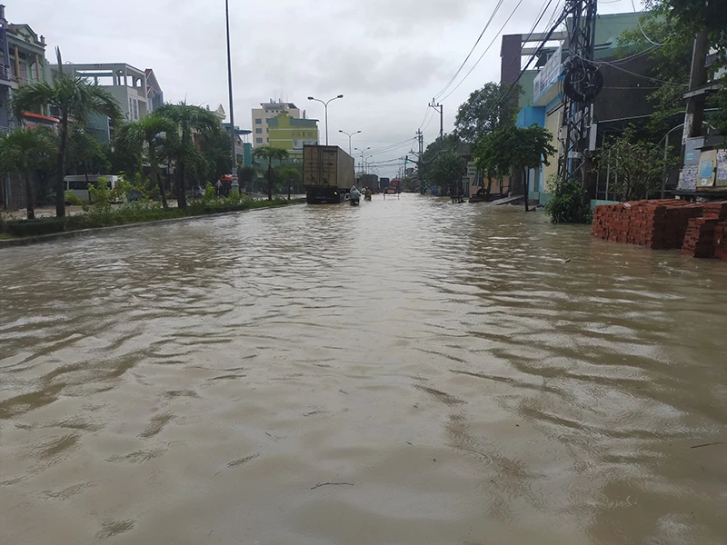 Nhiều đường phố ở Quy Nhơn bị ngập, không thể đi lại.