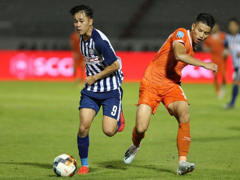 Bà Rịa-Vũng Tàu (áo sọc) thua đậm Bình Định, sau đó tiếp tục hòa An Giang khiến từ thế ứng viên nặng ký nhất giờ đánh mất quyền tự quyết vào tay Bình Định. Ảnh: VPF