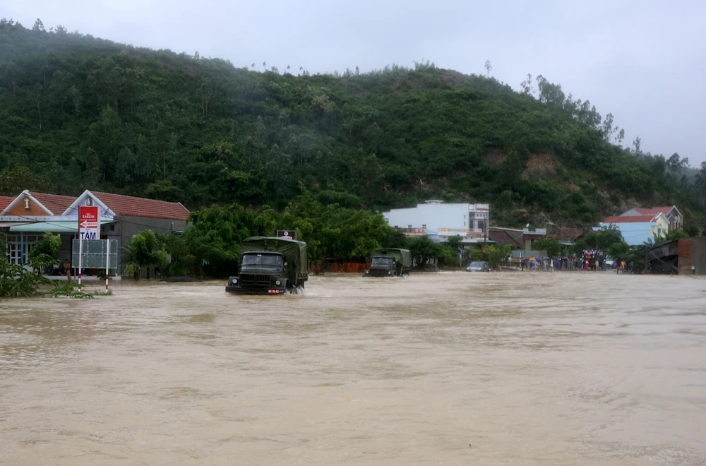 Xe của đoàn công tác của Phó Thủ tướng Trịnh Đình Dũng vượt lũ tới với người dân vùng lũ Bình Định. Ảnh: XT