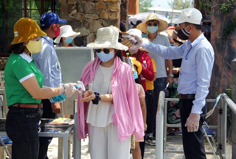Đo thân nhiệt du khách tại danh thắng Gành Đá Đĩa. Ảnh: TR.THI