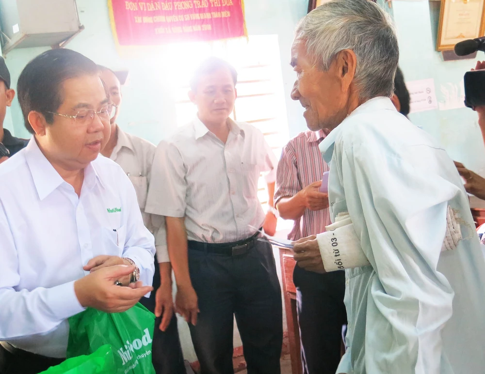Lãnh đạo Công ty CP Thực phẩm dinh dưỡng NutiFood (bìa phải) trao tiền, hàng cứu trợ nhân dân tỉnh Bình Định bị thiệt hại do lũ lụt.